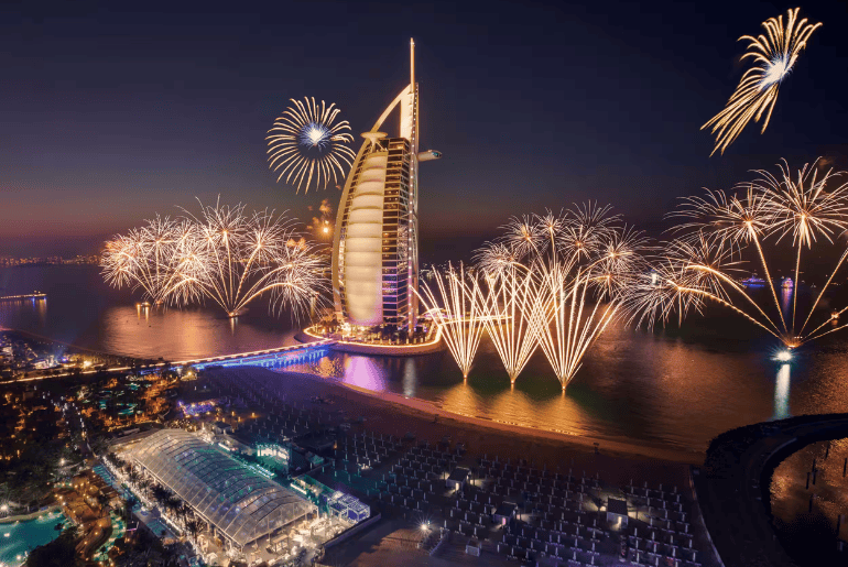 An iconic hotel deserves an iconic New Year’s Eve. While access to the hotel itself is exclusive, nearby restaurants and spots like Madinat Jumeirah, as well as surrounding beachside restaurants and public beaches, offer fantastic views of the Burj Al Arab fireworks.