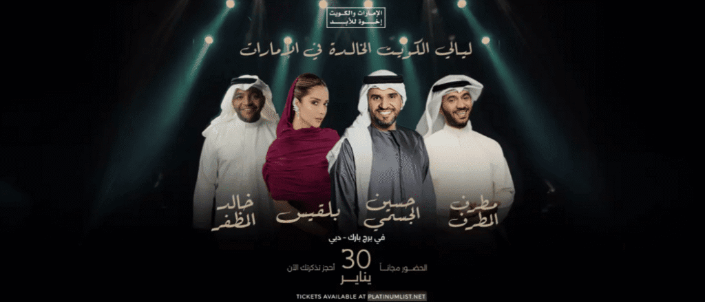This concert is all about unity, brotherhood, and shared pride. Through music, the evening celebrates the close cultural ties between the UAE and Kuwait, creating a warm and feel-good atmosphere where everyone comes together to enjoy the moment. The event is presented in collaboration with Dubai’s Department of Economy and Tourism, adding to its cultural significance.